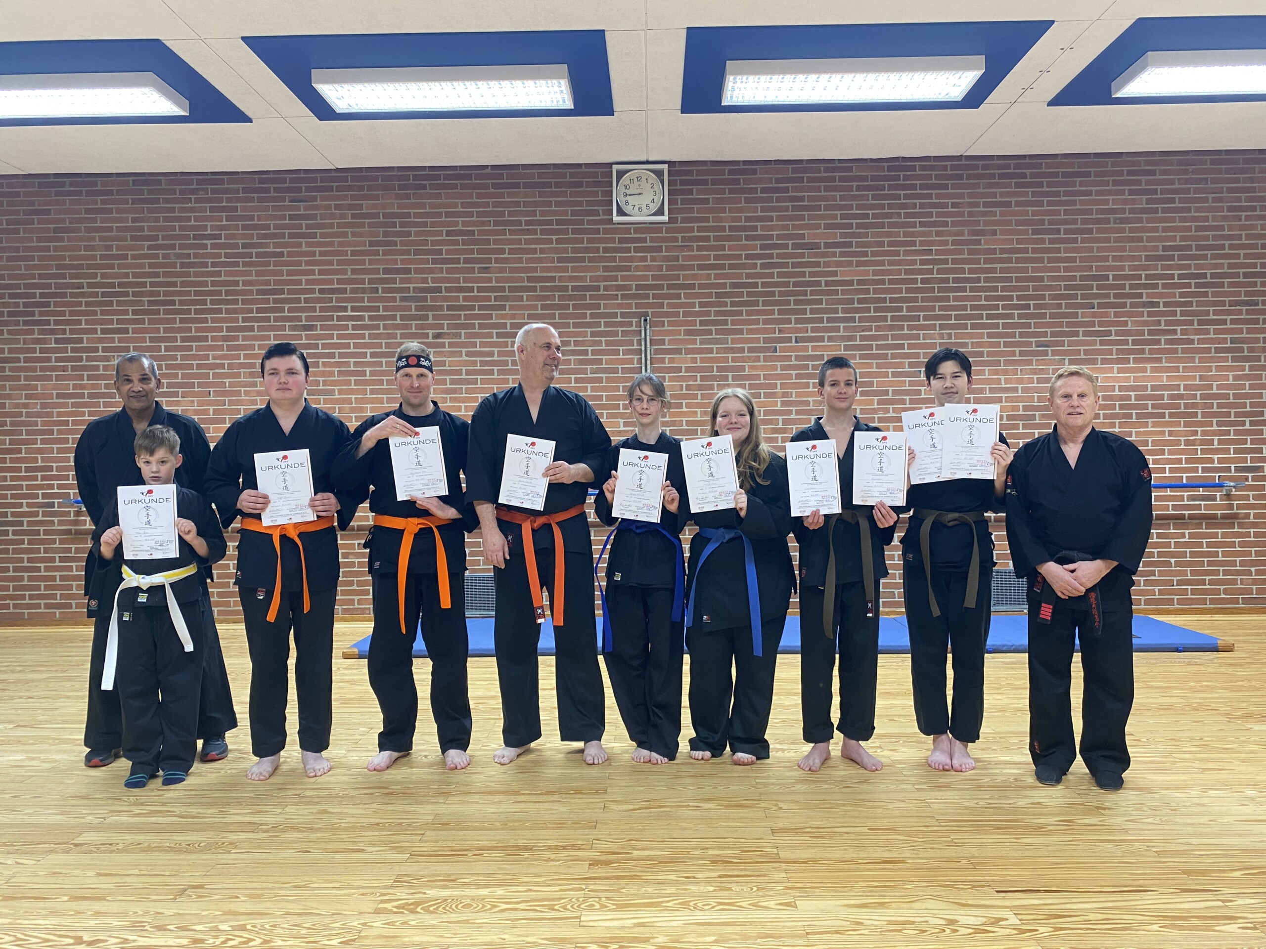 Die bestandene Prüfung wurde durch die DKV-Prüfungsurkunde und dem neu erworbenen Gürtel bestätigt. Alle hatten bestanden. In strahlende Gesichter wurden jedem Prüfling die DKV-Prüfungsurkunde, der DKV-Karatepass (Eintrag) und der neu erworbene Kyu-Gürtel überreicht.