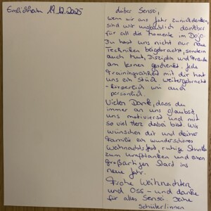 Mein ganz besonderer herzlicher Dank gilt Allen (ich war sehr gerührt), aber besonders Manuela, die sich wohl diese Mühe gemacht hat. Ganz herzlichen Dank für dieses tolle Präsent von euch zu Weihnachten in unserer Weihnachtsfeier nach der Prüfung. Herzlichen DANK