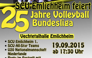 Ein besonderes Jubiläum des Emlichheimer Volleyballs wirft seine Schatten voraus. Am 19. September feiert der SCU "25 Jahre Volleyball Bundesliga". Weitere Infos gibt es auf www.scuvolleyball.de Plakatdesign: Alicia Nelson